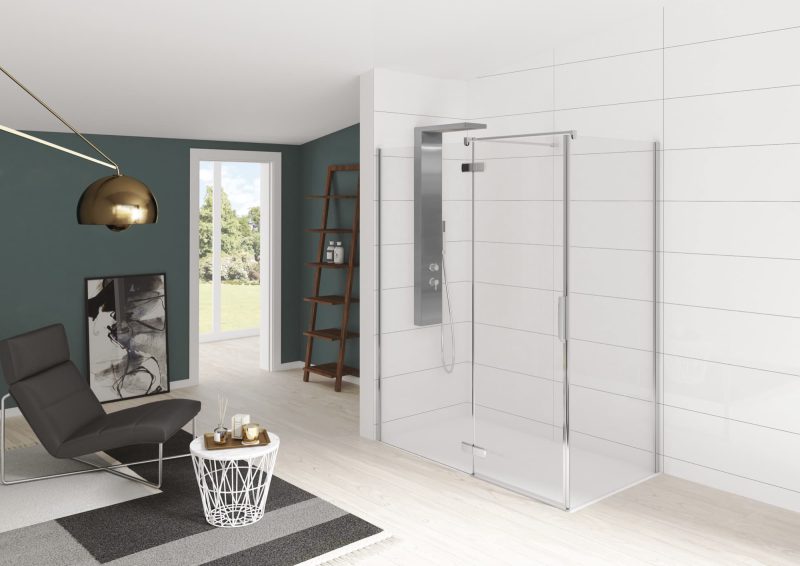 DetailsVerchroomde aluminium profielen; Verchroomde metalen scharnieren en handgreep; Verchroomde muursteun; Helder glas.