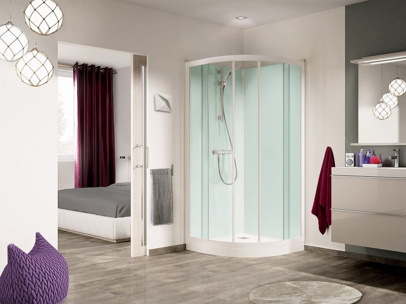 DétailsEntretien facilité : panneaux de fond en verre blanc opaque (5 mm); 2 portes pivotantes (4 mm) ou coulissantes (5 mm); Parties fixes (4 mm).